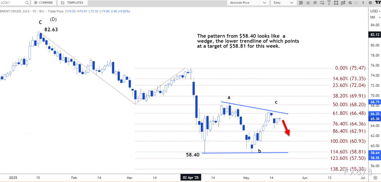 日线图上,自 58.40 美元开始的形态看起来像一个楔形,其下趋势线指向本周的目标 58.81 美元。