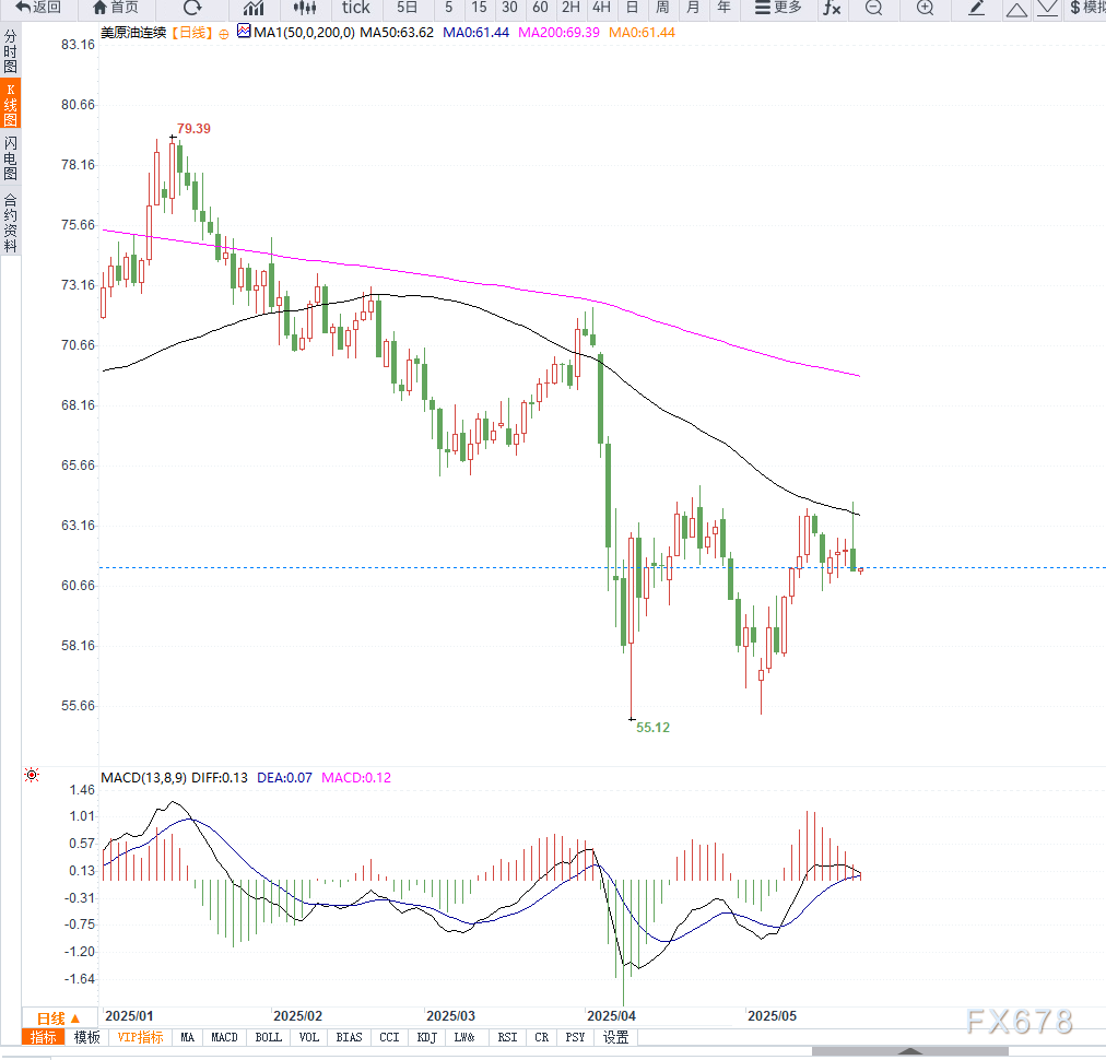 日产证券投资公司首席策略师菊川弘之表示:“虽然库存增加带来压力,但部分投资者预计,随着美国阵亡将士纪念日后进入夏季驾车旺季,库存或将逐步消化,从而对油价形成一定支撑。”   同时,市场对美伊核协议前景保持观望态度。据消息称,第五轮伊朗与美国核谈判将于5月23日在罗马举行。与此同时,以色列正在准备可能对伊朗核设施的打击计划,尽管目前尚无最终决策出台。   菊川弘之补充表示:“市场正面临矛盾信号的夹击,投资者普遍保持谨慎,避免持有大头寸,WTI短期可能在55至65美元区间震荡。”   OPEC+内部分歧增加供应不确定性   除美伊问题外,OPEC+联盟内部执行协议的分歧也对市场构成影响。据一位行业消息人士透露,哈萨克斯坦5月原油产量增长2%,无视OPEC+减产要求,或将削弱联盟的市场调控能力。   伊朗作为OPEC第三大产油国,若中东爆发冲突,势必影响全球原油供应流向,加剧市场波动。而美国加强对伊朗的制裁措施亦进一步限制其原油出口。   从技术图形来看,WTI原油日线图当前处于60至65美元之间的震荡区间。价格多次测试60美元支撑位未出现有效跌破,显示该区域存在一定买盘支撑。   但与此同时,油价在接近65美元上方时频繁遇阻,显示上方抛压较重,MACD指标动能柱缩短,RSI位于中轴附近,反映出市场缺乏明确方向指引。   若未来几日价格跌破60美元关口,则可能进一步下探至58美元;反之,若突破65美元,则有望挑战68美元一线。整体来看,当前走势偏中性,应密切关注库存数据及美伊谈判动态对市场情绪的影响。
