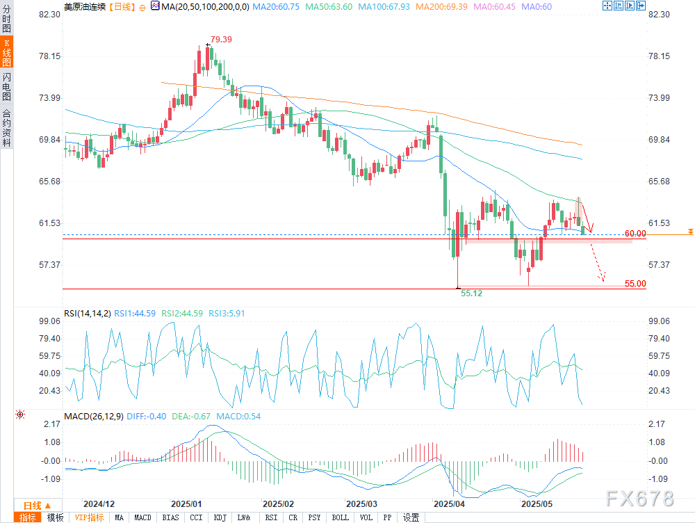 周四(5月22日)欧盘时段,原油价格从低点反弹遇阻后连续第二个交易日下跌。盘中报60.42美元每桶,跌幅1.87%。