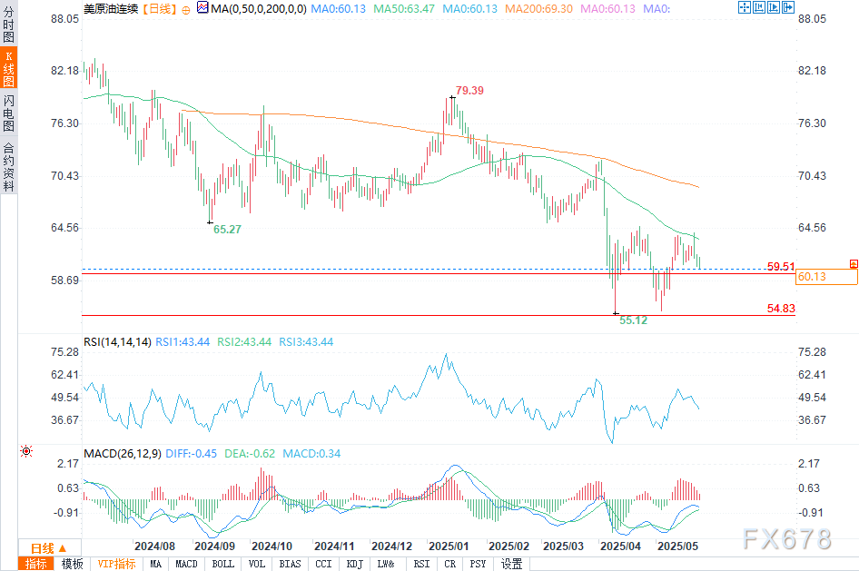 VT外汇官网——周五(5月23日),WTI原油走跌,盘中跌幅超过1.5%。交易员试图遏制已抹去近期涨幅的三日连跌走势。在受阻于62.59美元关键技术阻力位及62.80美元后,市场似乎准备测试短期枢轴点59.51美元。这一水平可能决定下一阶段走势方向。