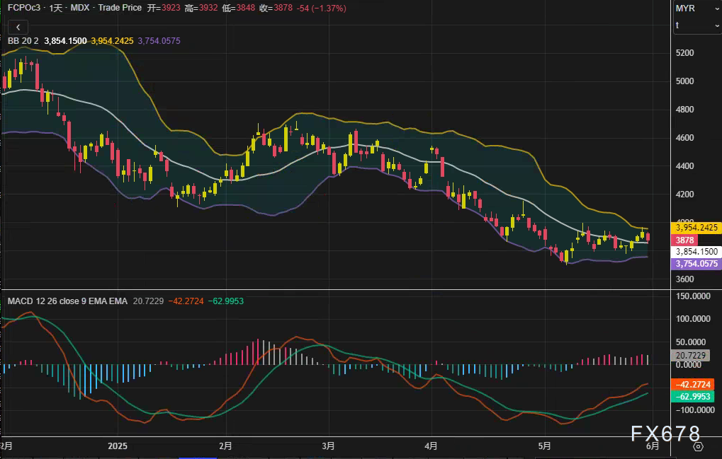 周五(5月30日),马来西亚棕榈油期货(FCPOc3)在周五收盘时出现回落,8月交割的基准合约收于3878林吉特/吨,较前一交易日下跌54林吉特,跌幅1.37%。尽管日内表现疲软,但本周合约整体仍录得1.33%的涨幅,连续第三周上涨。受芝加哥豆油价格走弱的拖累,棕榈油市场在本周最后一个交易日面临一定压力,但原油价格的稳定以及棕榈油在生物柴油领域的吸引力为市场提供了潜在支撑。本文将结合最新基本面、技术面以及机构观点,分析棕榈油市场的近期变化,并展望未来走势。
