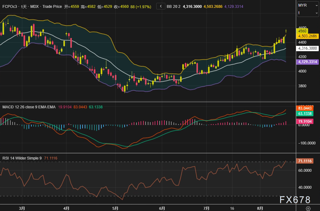 马来西亚棕榈油期货周一(8月18日)连续第二个交易日收涨,主力11月合约FCPOc3收盘上涨49林吉特(+1.09%),报4560林吉特/吨,盘中一度突破4500林吉特关键心理关口。技术指标显示市场动能强劲:日线布林带中轨4316林吉特形成支撑,RSI(14)报71.11逼近超买区,MACD柱状图持续扩张,暗示短期多头仍占主导。