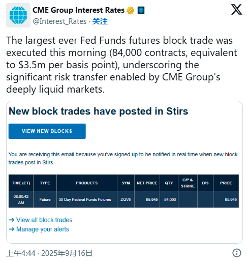 芝加哥商品交易所官方周二也已确认,这是联邦基金期货有史以来最大的大宗交易……