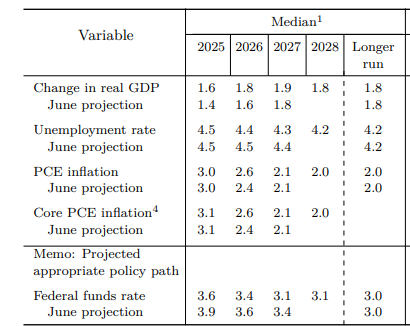 经济预期方面,较6月时的预期,美联储官员们整体预期GDP增速小幅抬高(2025年1.4%→1.6%、2026年1.6%→1.8%);失业率变化不大,还小幅下修了2026年的数据;但通胀更加顽固,2026年的PCE与核心PCE展望均抬高0.2%,至2.6%;对长期“中性利率”的预期维持在3%。
