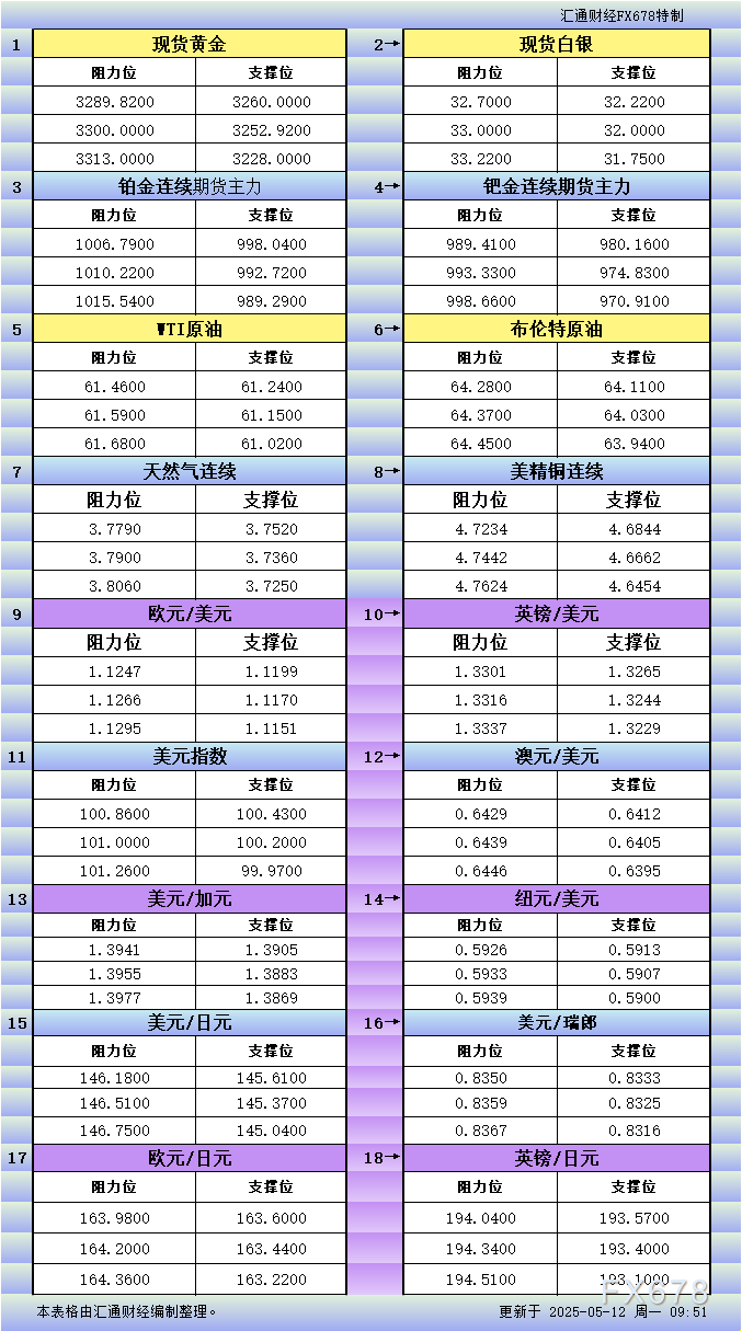 VT平台官网:5月12日亚市更新支撑阻力:18品种支撑阻力(金银铂钯原油天然气铜