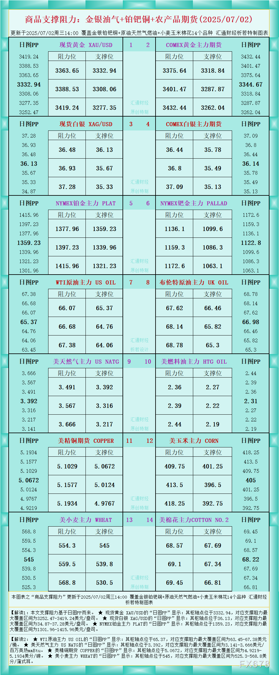 一张图看商品支撑阻力:金银油气+铂钯铜+农产品期货,更新于2025年7月2日周三14:00,具体...
