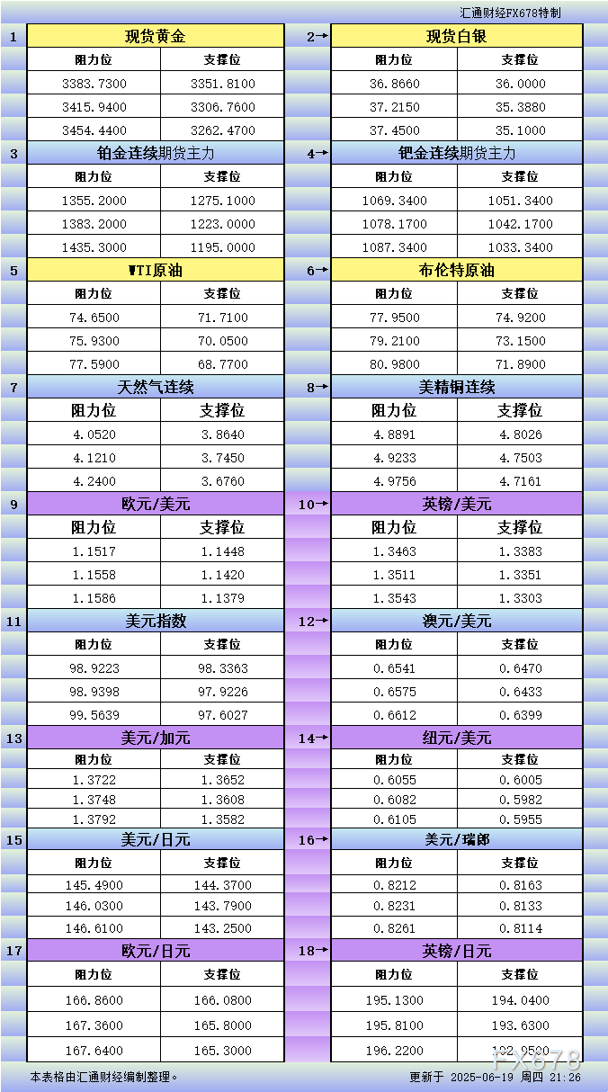 VT官网官网一张图看商品支撑阻力:金银油气+铂钯铜农产品期货(2025年6月19